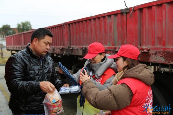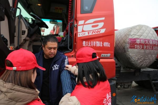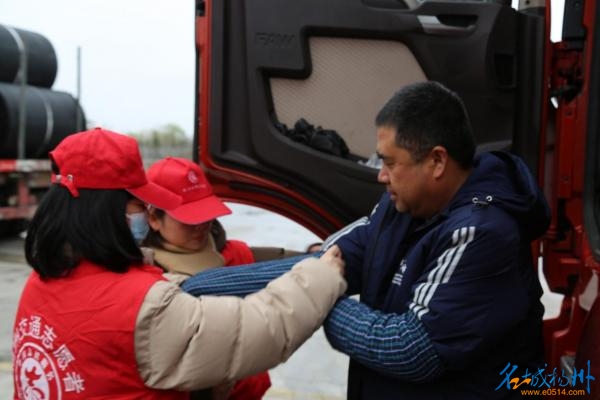 第二组在服务点设置便民服务台,摆放着袖套、毛巾、一次性水杯、方便面、饼干等物资。志愿者们主动为过往司乘人员递上方便食品,耐心解答公路出行相关问题。“来,师傅,干活袖口会脏,给您套上护袖,一起努力加油!”志愿者的风趣也带动了现场氛围,带来欢声笑语的同时也赢得了司机师傅们的点赞。