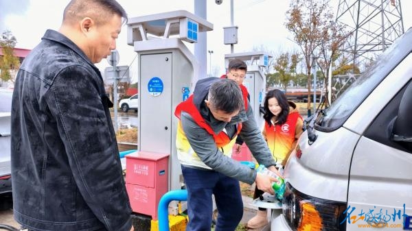 医疗服务后,志愿者们来到了服务区充电站。他们手持加注玻璃水的工具,为停靠在充电站的货车逐一加注玻璃水。在加注过程中,志愿者们还耐心地向货车司机们介绍充电桩的使用方法,并现场演示操作流程。司机表示,这样的志愿服务非常实用,切实感受到了来自社会的关爱。