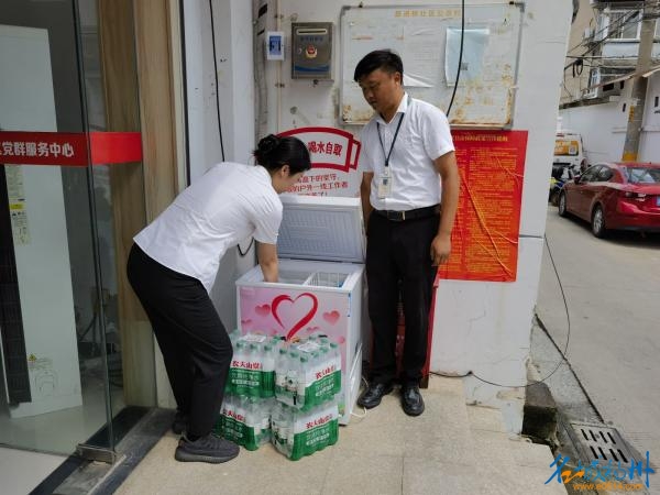 7月25日,在城东路104号跃进桥社区党群服务中心门口,鲜红的党建标识与贴着粉色爱心贴纸的“爱心冰柜”形成鲜明对比,成为炎炎夏日里一道靓丽的风景线。这处由绿城物业党支部赞助并提供瓶装水的“24小时自助爱心冰柜”,此刻正被党员志愿者们细心维护——他们不仅将清凉饮品整齐码放,更主动为外卖员、快递小哥等户外劳动者递上冰镇矿泉水。