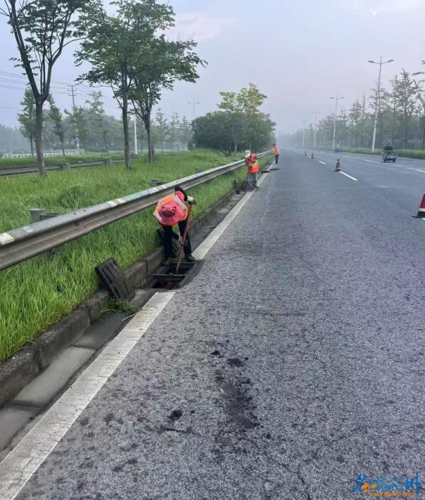 三是疏通“死角”,防止积水阻断交通。汛期前,江都分中心提前对管养路段的泄水孔、泄水槽等排水设施进行全面清淤疏通,并在G345易积水路段增设泄水槽,增强道路排水能力。强降雨期间,安排养护人员及时清理排水口杂物、树叶等,确保排水畅通,排除安全隐患。