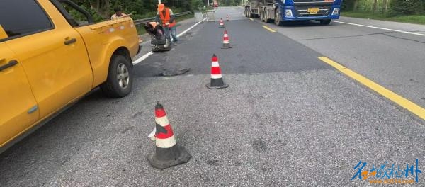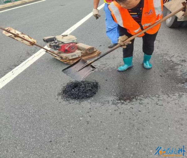 四是处置“全面”,力求快速抢修保畅。针对汛期路面病害,江都分中心运用多种抢修材料,提升应急处置效率。一方面,对雨天出现的紧急坑槽,采用冷补料临时垫补,确保行车安全,同时引进水补料修补技术,实现雨天照常施工。另一方面,抢抓晴好天气窗口期,集中力量开展热补料标准化修补,提升修复质量。