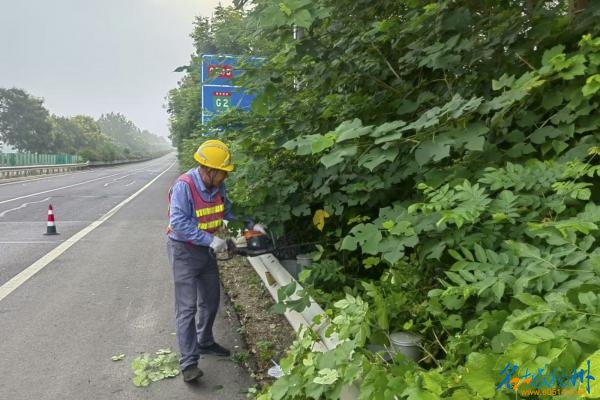 9月3日,扬州市公路事业发展中心宝应分中心组织养护人员在344国道宝应段开展绿化修剪行动,及时清理遮挡交通标志牌的树枝,确保行车安全。