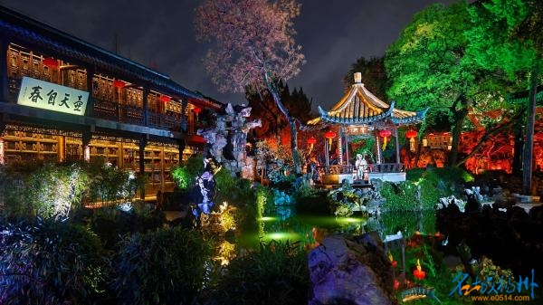 当月华流照,白日的喧嚣褪去,竹石庭院间的灯光亮起,精心编排的夜游演艺,在园内次第绽放。