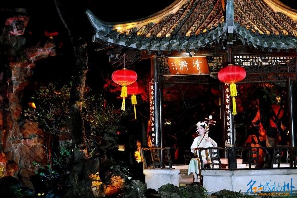 刚改造完毕的个园水榭舞台,光影效果格外出众。伴随着悠扬的乐曲,演员们用翩翩舞姿将竹的清雅、荷的柔美展现得淋漓尽致。紧随其后登场的琵琶与二胡的民乐联奏,或古典或新潮,动感十足。