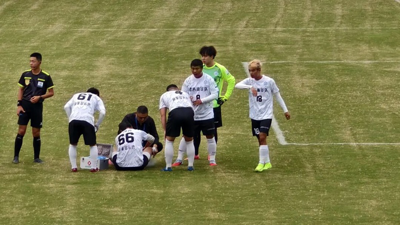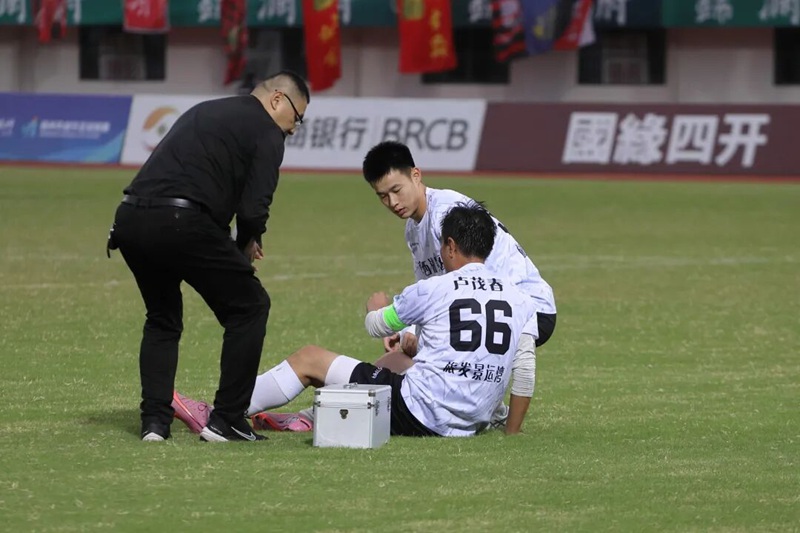 比赛进行到28分钟,瘦西湖景区队66号卢茂春在激烈拼抢中不幸受伤,距离最近的几名球员第一时间冲到卢茂春身边,俯下身焦急地询问着他的状况。队员们自发地围拢在他身边,这股温暖的力量,化作了球队更坚韧的斗志。