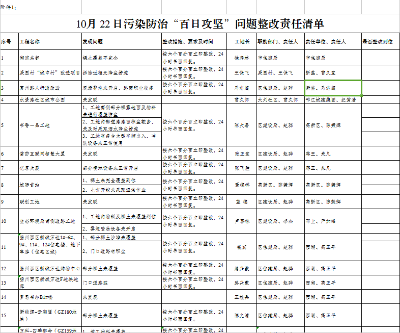 同时组织工地长、路段长、网格长对辖区内扬尘管控情况开展常态化检查,并从10月19日起,全面开展建筑工地扬尘防控驻点工作,发现问题立即上报,并限相关责任单位24小时内整改到位。