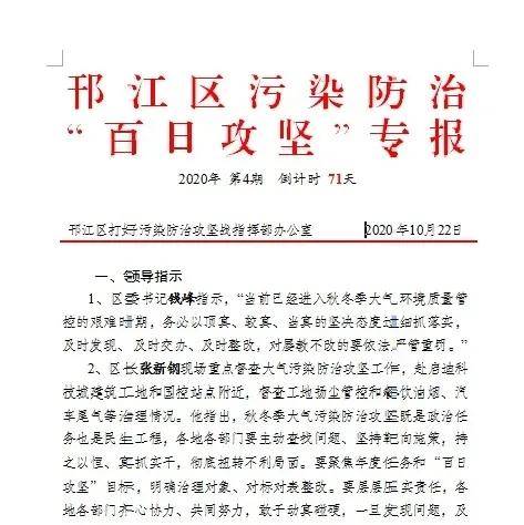 导读: 每年秋冬季节,都是大气环境质量管控的重点时段。扬州市邗江区与全省同步,强力推进扬尘污染防治“百日攻坚”行动,经区污防攻坚办研究,决定在“百日攻坚”行动期间,成立工作专班,紧盯问题整改,强化督查督办,建立通报机制,坚决确保全区完..
