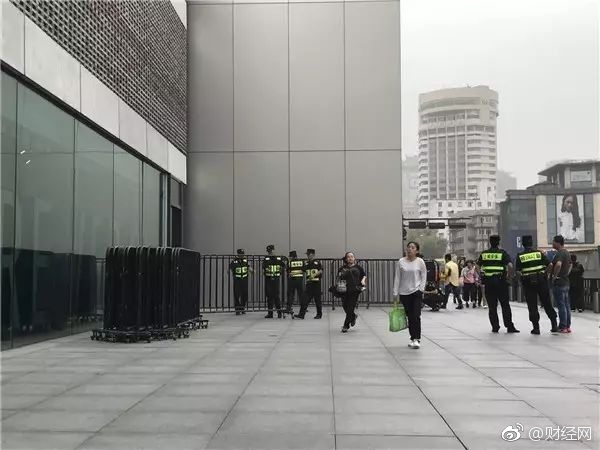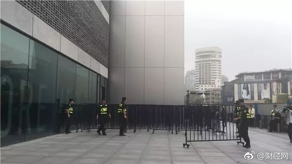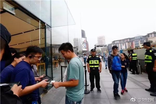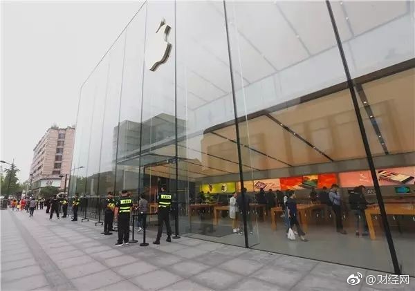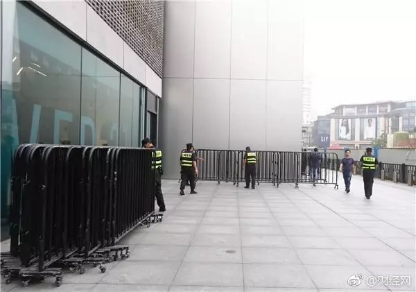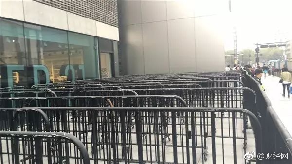 杭州苹果西湖店,早上6点多来了三四十个保安。黑色栅栏架势十足地列了一整排,拐了好几个90度的弯。