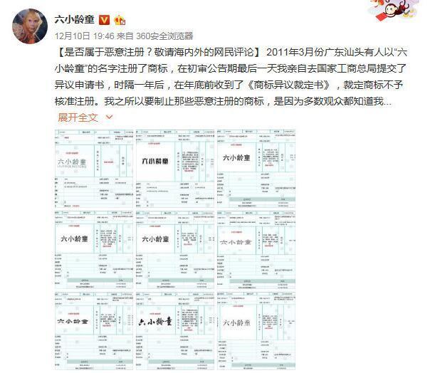 12月10日晚,六小龄童在微博发长文表示“六小龄童”这个艺名被恶意抢注商标,并晒出多张以“六小龄童”为名的不同产品及商标。