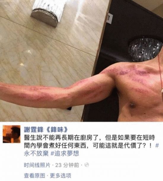 照片中,谢霆锋刮痧后的手臂多处呈紫红色,淤青十分严重。网友纷纷表示心疼,留言称:“所以赶紧放弃煮饭去拍戏唱歌啊!,快听你医生的话!”“谢先森这人拍戏不要命,做饭也这么拼!”