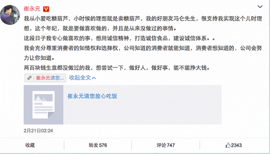 崔永元在其新浪微博中表示,“从小爱吃糖葫芦,小时候的理想就是卖糖葫芦,我的好朋友冯仑先生,很支持我实现这个儿时理想,这个年纪,就是要做喜欢做的,并且是从来没做过的事情。”