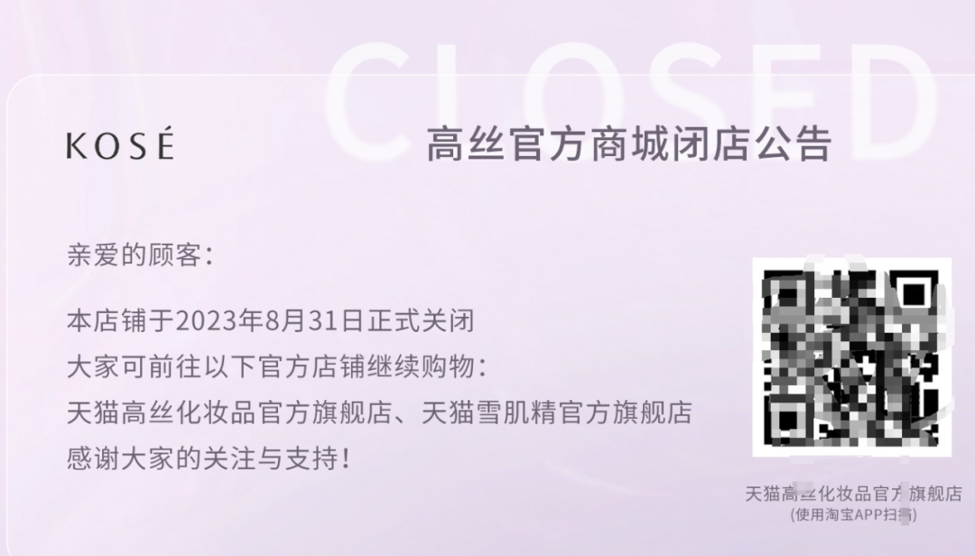 日本三大美妆公司之一的高丝,即将关闭天猫店铺。近日,天猫高丝化妆品官方旗舰店发布公告,将于2024年4月19日结束运营。