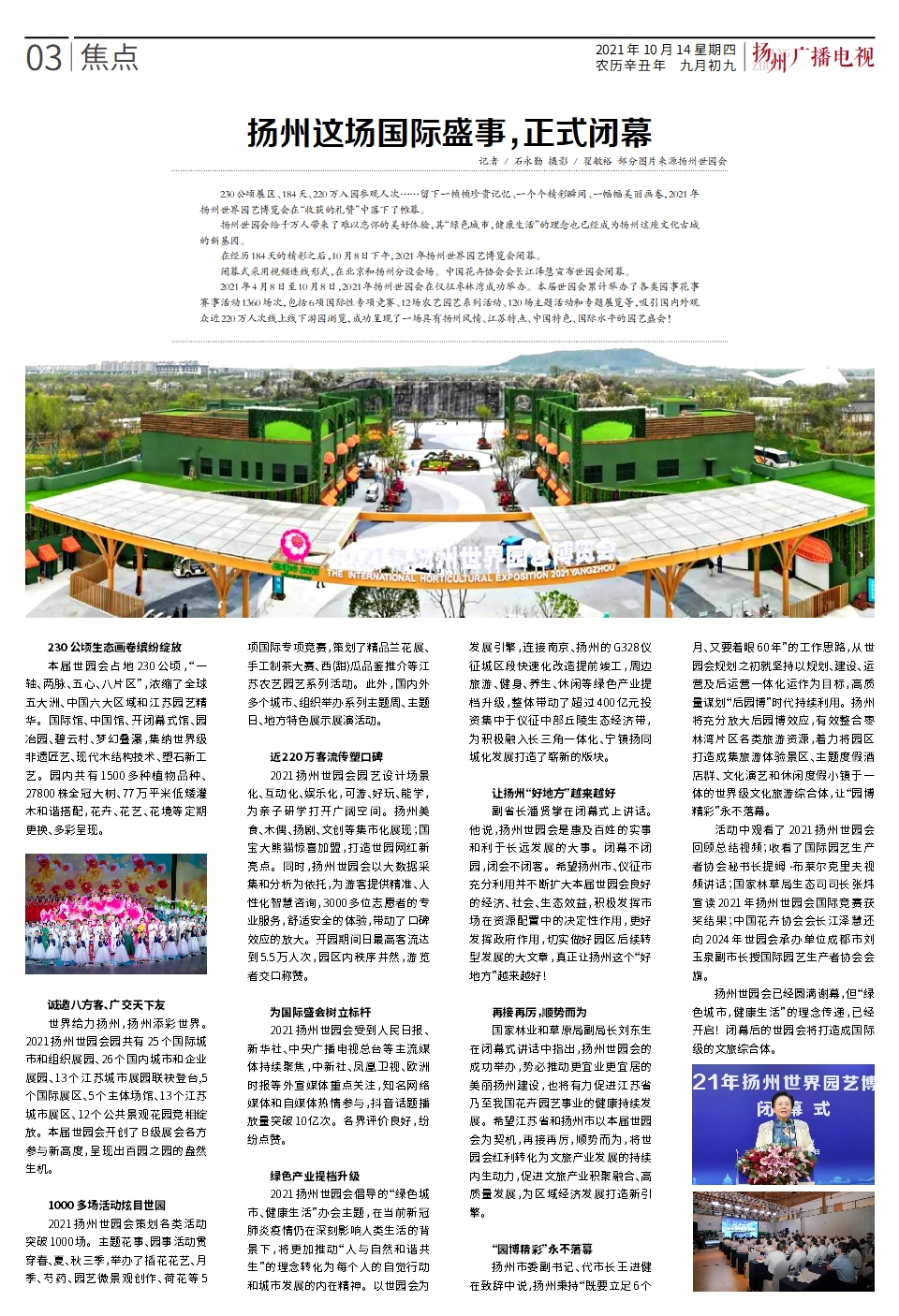 230公顷展区、184天、220万入园参观人次……留下一帧帧珍贵记忆、一个个精彩瞬间、一幅幅美丽画卷,2021年扬州世界园艺博览会在“收获的礼赞”中落下了帷幕。